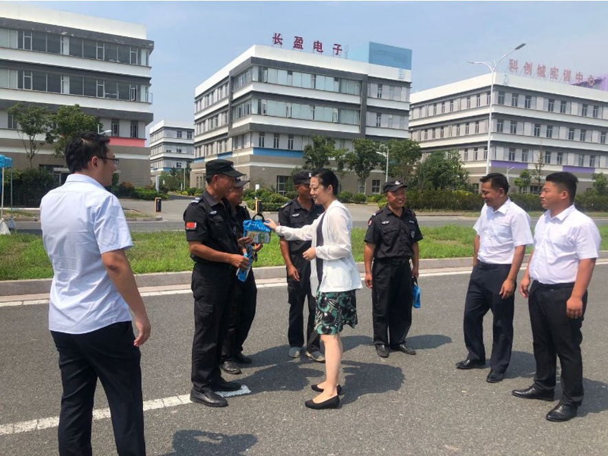 本次高溫慰問活動由產(chǎn)業(yè)公司副總經(jīng)理尤麗華帶隊,深入工作一線,分別向教學(xué)區(qū)、產(chǎn)業(yè)區(qū)及十里藍院一線保安、保潔等工作人員送上防暑降溫慰問品。